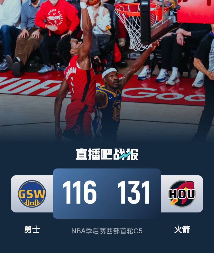 5月1日讯 NBA季后赛西部首轮G5,火箭今日回到主场迎战勇士,在连赢两个主场后勇士已经3-1拿到赛点,而火箭则是已经没有退路,此役库明加和泰特缺战。