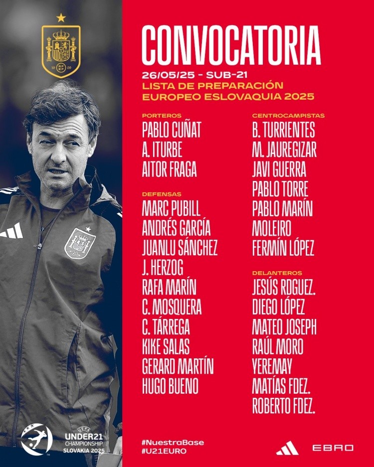 5月26日讯 西班牙U21青年队公布了新一期名单,费尔明、杰拉德-马丁、托雷在列。西班牙U21将在6月份的友谊赛中对阵乌克兰U21,然后参加欧青赛。