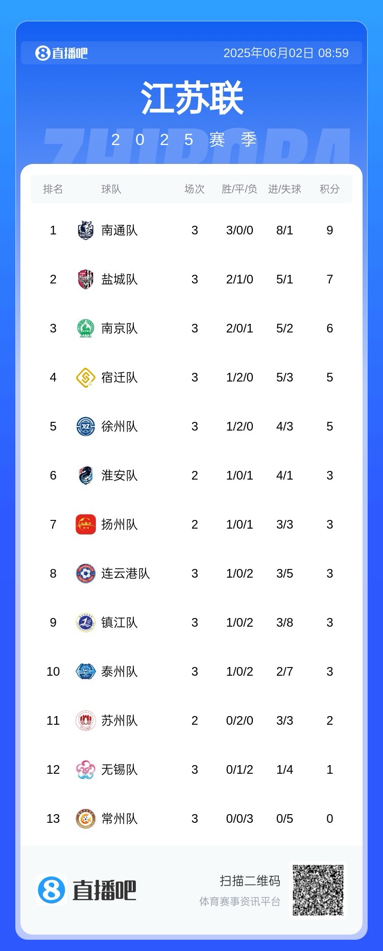 各位江苏十三太保的球迷可以去足球→全民赛事频道,查看对应的积分榜!