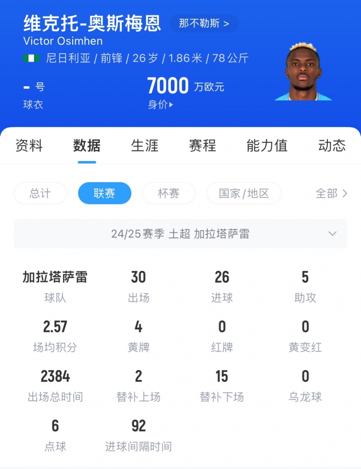 26岁的奥斯梅恩于去年从那不勒斯租借至加拉塔萨雷,目前租借到期回归,他与那不勒斯的合同将在明年到期,目前身价7000万欧。