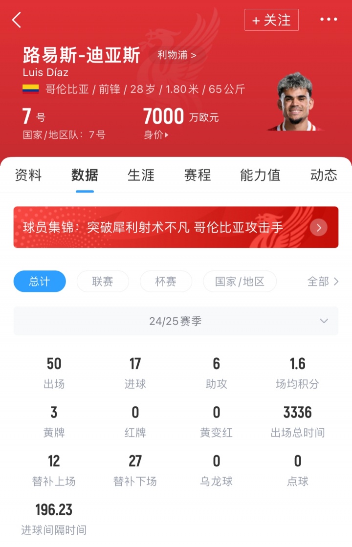 上赛季,迪亚斯为利物浦出场50场,取得了17粒进球和6次助攻,目前其德转身价为7000万欧元。