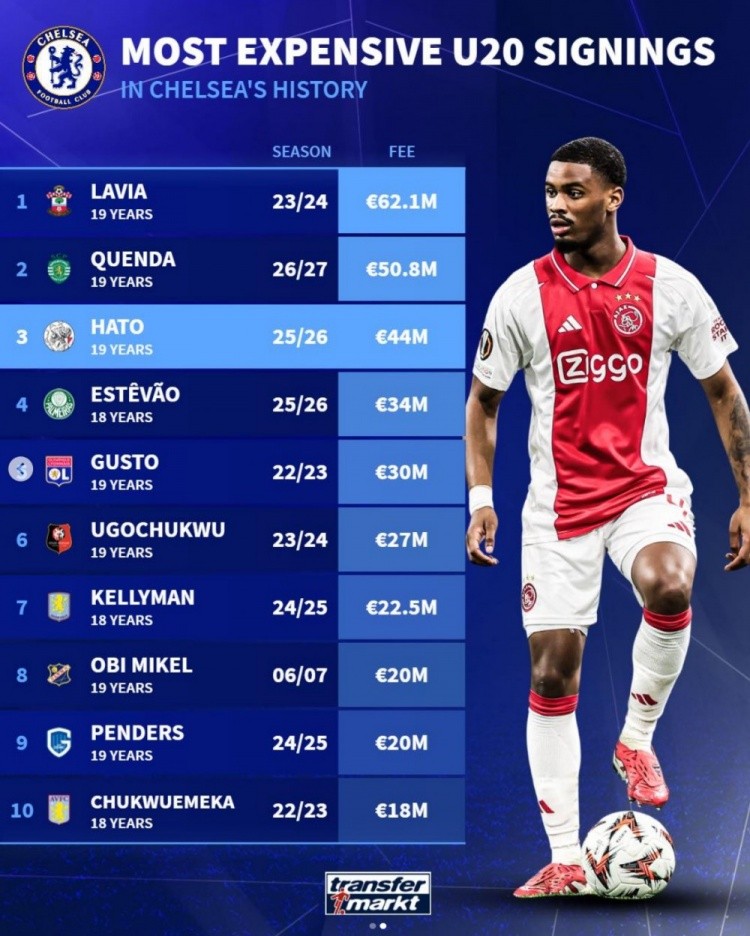 8月4日讯 德转盘点了切尔西队史在引进U20球员上花费榜,其中新援哈托第三,拉维亚居首,具体如下: