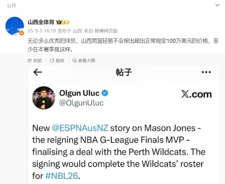 媒体人@山西全体育 转发了Olgun Uluc的报道,并在旁边写道:“无论多么优秀的球员,山西男篮轻易不会报出超出正常规定100万美元的价格,至少在本赛季是这样。 ”